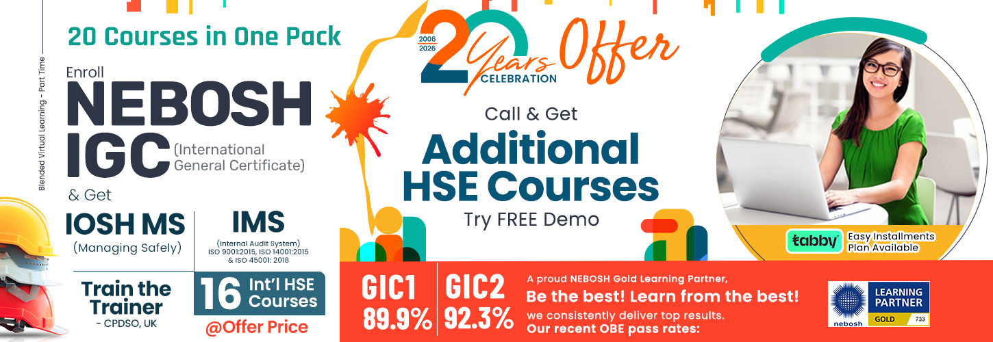 Green World Group, UAE – the KHDA Safety Training Institute in Dubai offers various accredited HSE Courses such as NEBOSH, IOSH, OSHA, RoSPA assured Courses, CPD Standards & CPD-UK Qualifications, HACCP Certifications, Lead Auditor Courses, and also other industry-specific HSE qualifications. These qualifications are globally recommended for Health and Safety roles in various industries across the world.