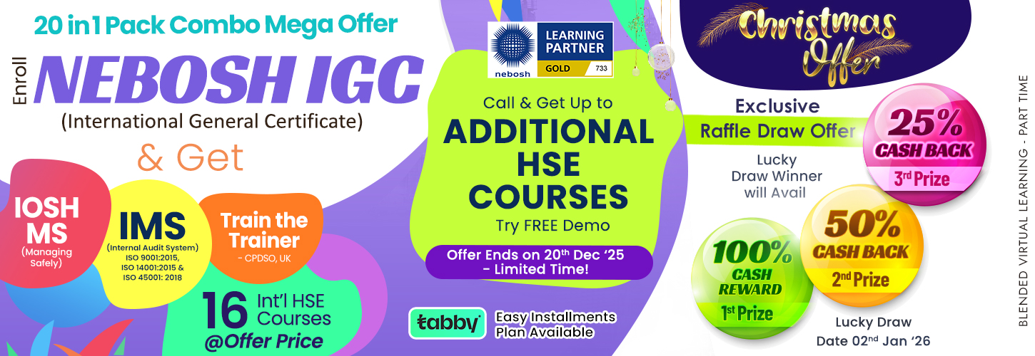 Green World Group, UAE – the KHDA Safety Training Institute in Dubai offers various accredited HSE Courses such as NEBOSH, IOSH, OSHA, RoSPA assured Courses, CPD Standards & CPD-UK Qualifications, HACCP Certifications, Lead Auditor Courses, and also other industry-specific HSE qualifications. These qualifications are globally recommended for Health and Safety roles in various industries across the world.