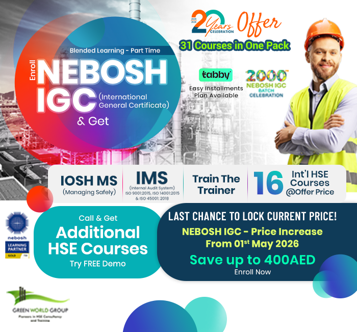 Green World offers the NEBOSH IGC Level 3 Certificate in the UAE. Enroll with a NEBOSH Gold Learning Partner for expert-led HSE training and global certification. NEBOSH (National Examination Board in Occupational Safety and Health) IGC certificate is a widely recognized HSE international certification that provides learners with essential knowledge and practical skills to manage the workplace effectively.