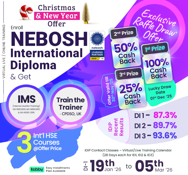| Eligibility | IDIP learners should have prior HSE knowledge (NEBOSH IGC or any equivalent level qualification) or minimum of 5+ years experience in HSE domain | ||